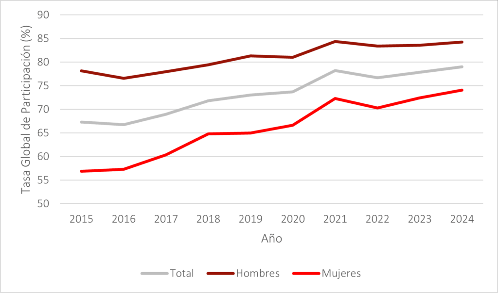 Figura 4. Evolución de la Tasa Global de Participación a nivel nacional y por sexo (2015–2024)
