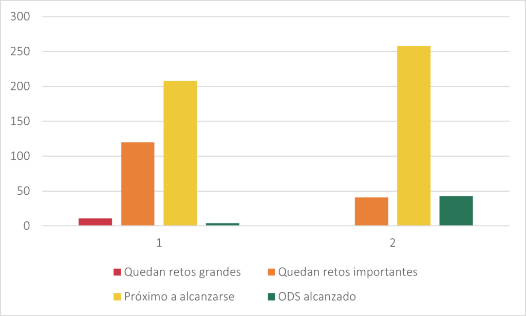 [4] La comparación se realizó clasificando a los municipios en: ODS alcanzado, próximo a alcanzarse, quedan retos importantes y quedan grandes retos. Esta separación se hizo utilizando la media y la desviación estándar del indicador.