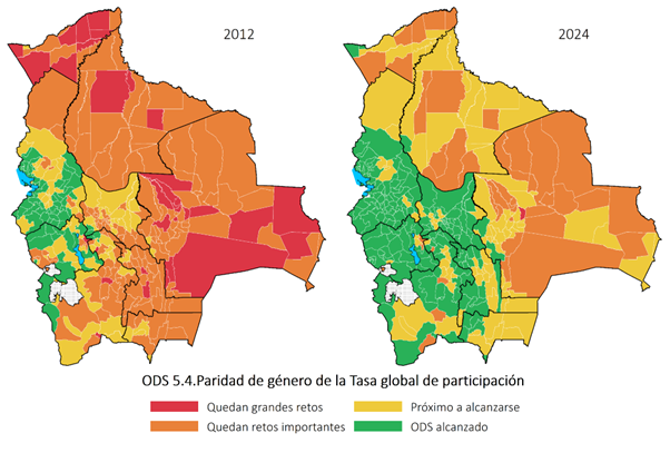 La TGP es esencial para monitorear las brechas de género y evaluar el impacto de políticas laborales, económicas y de cuidado. A partir de esta necesidad surge el indicador de paridad de género de la TGP, que compara directamente la participación laboral de mujeres y hombres. Cuando el indicador se acerca a 1, significa que ambos grupos participan en proporciones similares; cuando se acerca a cero, evidencia que las mujeres enfrentan desventajas estructurales y su participación es mucho menor a la de los hombres. En Bolivia, este indicador permite medir el avance hacia el indicador 5.4 del ODS 5, que busca garantizar que mujeres y hombres tengan igualdad de oportunidades en el empleo y en la contribución económica.